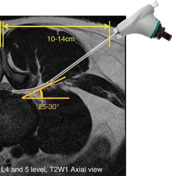 척추관 내시경 처럼 레이저를 이용하여 돌출 된 디스크의 크기를 줄이지만 꼬리뼈가 아닌 추간공 (허리) 을 통해 척추관으로 접근하게 됩니다. 허리를 통해 시술을 위해 설계 된 전용 삽입관을 피부에서 척추까지 길게 삽입하여 내부에 설치 된 내시경을 통해 병변을 확인하고 레이저 카테터를 삽입하여 디스크의 크기를 줄입니다. C-arm을 이용하여 정확도와 안전성을 높이게 됩니다. 척추관 내시경으로 접근이 어려운 척추 가쪽관의 디스크 돌출 병변에 좀 더 쉽게 접근이 가능하며 전신 마취 없이 국소 마취만으로 시술 진행이 가능 합니다.