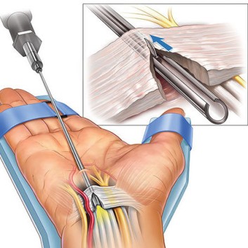 바늘과 톱실을 이용하여 초음파 감시하에 횡수근인대를 절개합니다. 손바닥 혹은 손목의 피부를 전혀 절개하지 않는 비수술적 방법이라는 큰 장점이 있으며 현재까지 재발률이 거의 없는 것으로 보고 되고 있습니다. 하지만 초음파를 이용하여 진행하는 만큼 주변 조직의 손상 가능성을 고려 해야 합니다.